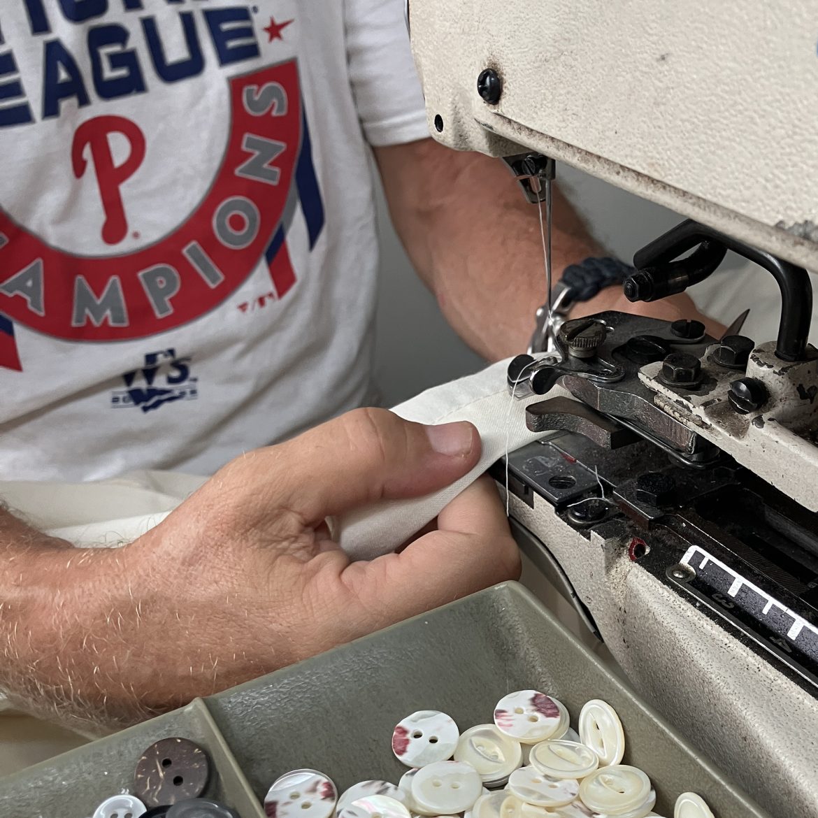 One of the reasons that Tender’s clothes have their own special feel is the selection of machines used. Clothes sewn in the UK were largely constructed with feed-of-the-arm single-pass felled seams. In the new US factory these machines are not available, so garments are sewn with single-needle sewing machines, making seams that are slightly flatter and more elegant. On the other hand, as the seams are constructed with two sewing passes judged by eye, the stitch lines are not quite as even and regular, adding a slightly different humanity into them.
