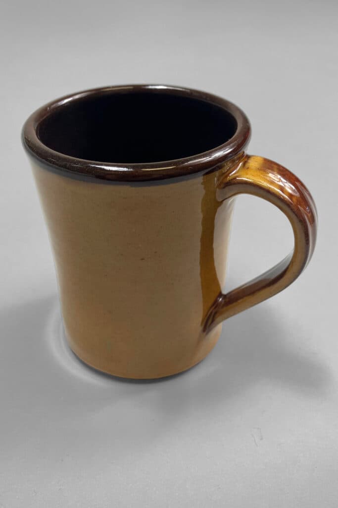 Throwing pots by hand involves drawing the desired form up from a single solid spinning lump of clay. Tender’s potter works the clay directly with his bare hands, so each piece is unique and bears the marks of his fingers and thumbs. Rather than casting the handle from slip (watered down wet clay), which would enable uniform and quick mass-production, it is traditionally hung. This involves squeezing a lump of solid clay out into a strip which the potter allows to hang through his fingers, creating a naturally pleasant shape to hold. The ridges on the handle, formed by the creases in the craftsman’s fingers, make it easy and comfortable to grip. The handle is pressed onto the pot with a thumb dent at the base.