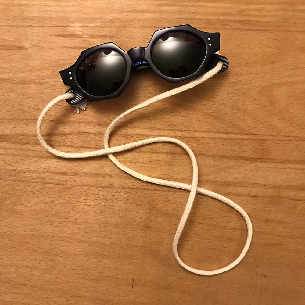 The fronts of the frames are carved out from a single thick sheet of acetate, scooped away at the back around the cheeks and eyebrows, with the full thickness at the nose and temples. The sides are shaped to grip the head, then curve gently down over the ears. A hole is drilled through at the tips of the side bars, as an interpretation of the way in which wire spectacles were made in the 18th Century. The wire was bent around to form a loop at the end, which would shape to the ears and head. The hole in the tip of Tender’s glasses allow them to be worn with a neck cord, and are delivered with a removable braided cotton cord.