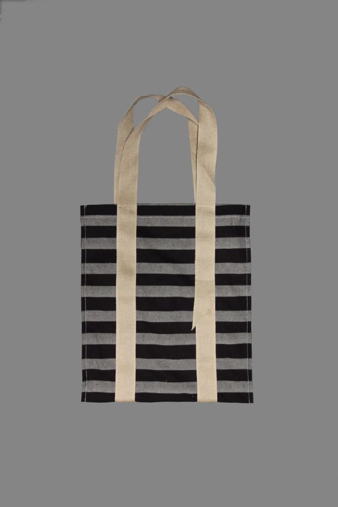 The oversized One-strap tote bag is folded along the bottom edge, so there is no seam to create a weakness in the fabric. A single wide webbing strap loops around the bag twice, creating both handles, and is cut raw on the bias, at the overlap.
