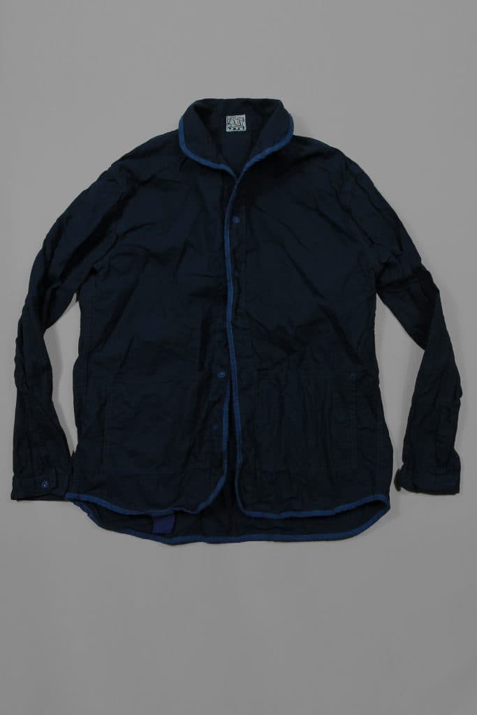 The Bound Edge Flipped Collar Shirt was an experimental tangent on the way to developing the 468 Flipped Collar Shirt. Like the 468, the front placket is reversed and sewn down on the outside, trapping two large centre pockets low down at a comfortable hand height and the collar is flipped upside down so that the long side, not the short side, is sewn into the neck of the shirt. Here, however, the entire edge of the shirt, including the entire collar, is bound in a continuous sweep of ecru cotton bias binding. The idea was to follow earlier bound edge shirts to their logical conclusion, and in the process evoke traditional pyjama jacket construction, with white piping around a blue body and white linen covered metal buttons. This contrast is rendered more or less subtle by the garment dyeing after the shirt is finished.