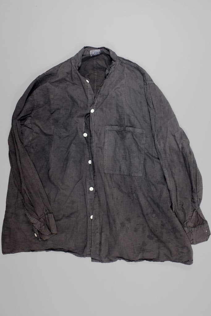 The pleats add volume into the skirt of the garment, which is cut without side seams, so that the tails hang freely without weight or stiffness. A single chest pocket on the left and full tailored cuff plackets behind the wrist refer to more traditional shirt making.