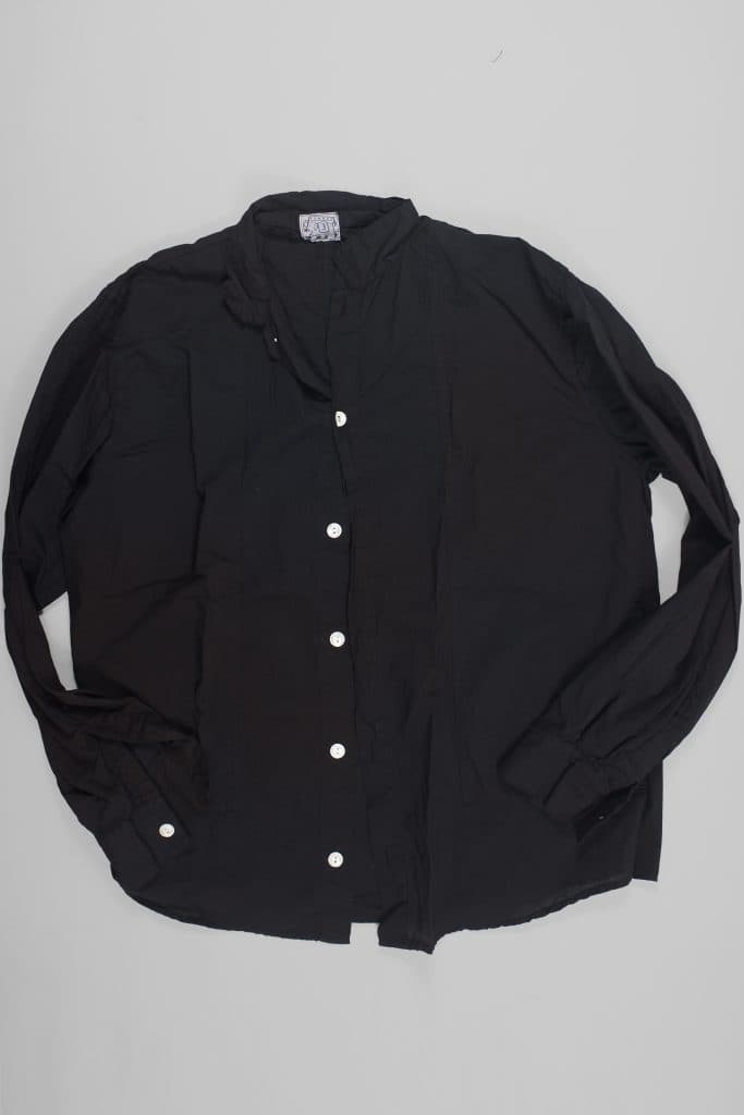 The shirt is cut on the Tender Butterfly block, with no side seams and reversed sleeves, joined along the top sleeve and into the shoulder. Unlike previous butterfly shirts, cuffs open with full tailored plackets behind the wrist.