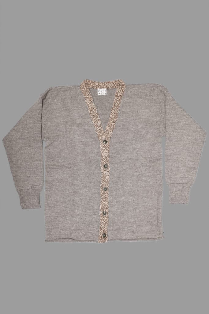 The Donegal Edge Ryeland Cardigan is knitted from fine undyed Ryeland wool, from sheep reared in the Scottish Borders. The placket and neck binding are a contrast, much thicker, soft Donegal yarn. This gives the substance and softness of a much thicker garment, while being thin enough to wear comfortably under a jacket, or in warmer weather. The fully fashioned body is cut generously, with square armholes and shoulders, and the hem is left without any ribbing so that it rolls up. The cuffs are finished in a traditional rib.