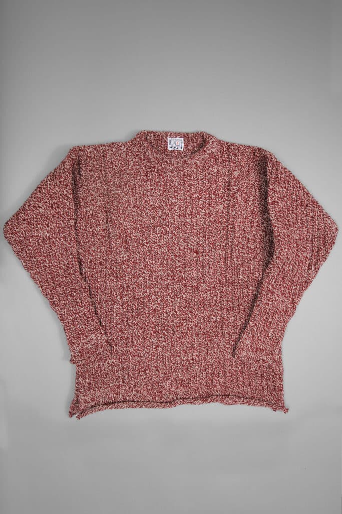 The body of the pullover is knit in an inverted rib stitch, usually used for cuffs and hems, while the cuffs and hems are knit in a plain stitch, usually used for body panels.The deep gussets under the arms, and the side splits, are reminiscent of a traditional British sailor’s gansey, while the looser, softer texture of the stitch makes it a comfortable garment to layer over a light shirt or under a jacket.