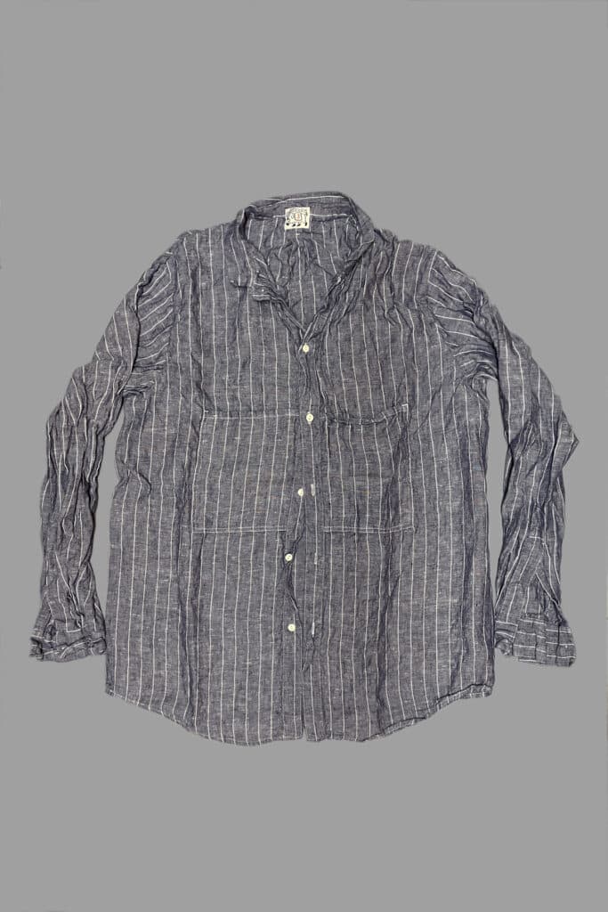 The Weaver’s Stock Butterfly Shirt is a tailored adaptation of the mainline Type 430 Butterfly Shirt, and is single-needle sewn with french seams. There are no side or back seams, the sleeves are inverted, and two chest pockets are tucked into reversed plackets. The cuff plackets are traditionally constructed with a full tailored cuff, a first for Tender, making this style more redolent of fine tailored shirts than other, more workwear-structured, styles. The smaller cream catseye buttons are deadstock melamine.